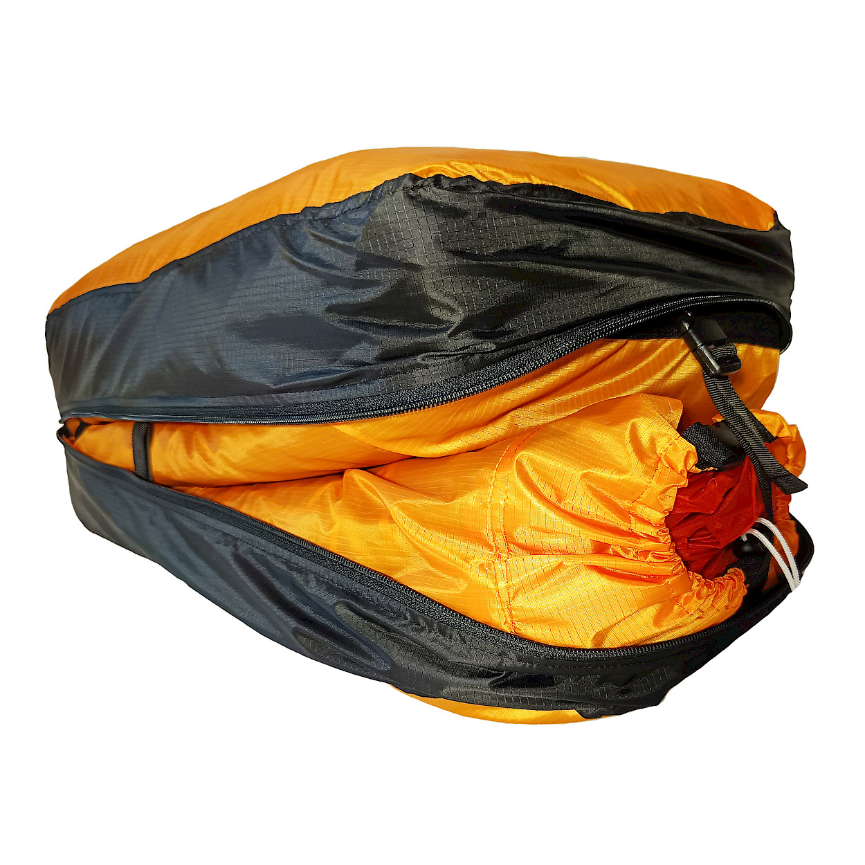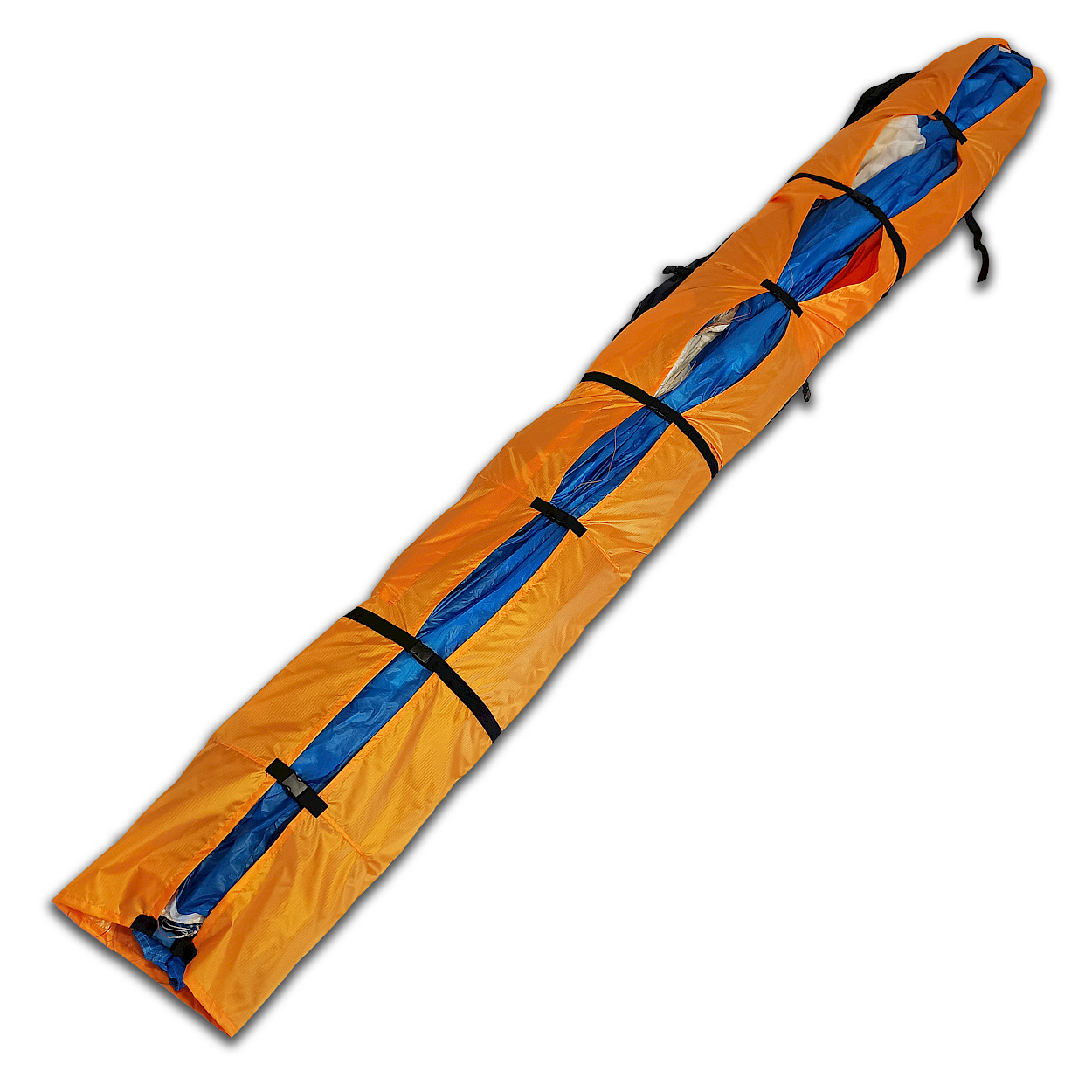 Компрессбэг Брикет — это концертина, которая позволяет сложить крыло не только правильно, но и компактно. Своим названием чехол обязан особой форме, которая придает ему внешнее сходство с брикетом пятигорского мороженого. Опытным путём установлено, что упаковочный объём параплана, уложенного в такую концертину, уменьшается до двух раз. Никаких лишних ремешков, стяжек, верёвочек — всё предельно лаконично и просто. По всей длине установлены качественные фастексы. В верхней части есть маленькая стяжка для передней кромки крыла. Основные цвета — комбинация оранжевого и серого. Молния YKK!